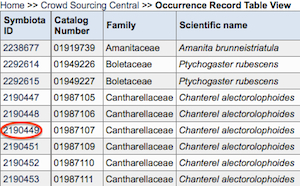Once selecting a record set to work on, you will see a series of records from a given institution that need to be completed. In order to start transcribing a label to complete the specimen record, click on the corresponding 'Symbiota ID' (e.g., the ID '2190449' circled in red in the image to the right for a specimen record of Chanterel alectorolophoides, an older name for Cantharellus cibarius). Clicking on this ID link will take you to an editing page where you can enter data as you transcribe the specimen label from an image of the label that will appear on the editing page to the upper right (see image below). |