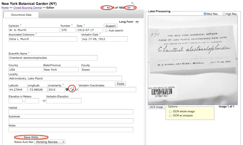 Don't forget to click on 'Save Edits' button (circled in red at the bottom of the editing page in the image below) once you have finished transcribing the label for a particular specimen record (Note - transcribed data entered and saved will not appear on mycoportal.org records until it has been approved by the corresponding institution's collection manager). If the record is too difficult to transcribe, simply move on to the next record by clicking on the record navigation arrows (circled in red at the top of the editing page in the image below). Detailed notes on transcribing, including how to zoom in on elements in the image label, are provided below. Click on these links to learn more about the institutions making their data available for crowdsourcing: