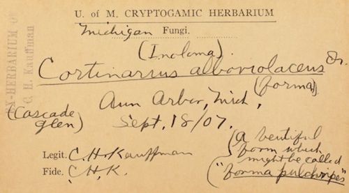 The image to the right is a label from a fungal specimen collected by Calvin Henry Kauffman, an early American mycologist. Fungal specimen labels such as this contain a few basic types of data, including the name of the fungal species (i.e., Cortinarius alboviolaceus), the collection locality (i.e., USA, Michigan, Ann Arbor, Cascade Glen) and date (i.e., September 18th, 1907), the collector/s (i.e., C.H. Kauffman), as well as notes (i.e., A beautiful form which might be called "forma pulcheripes”). Other types of information about where the specimen was collected (e.g., the substrate the fungus was growing on and/or the habitat in which the specimen was found) may also be included. |